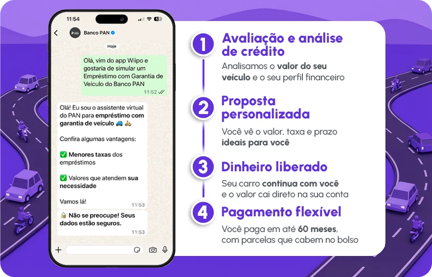 O empréstimo com automóvel de garantia é uma parceria entre a Wiipo e o Banco Pan, que permite transformar seu carro ou moto em uma solução inteligente de crédito, com condições mais vantajosas do que o empréstimo pessoal tradicional.