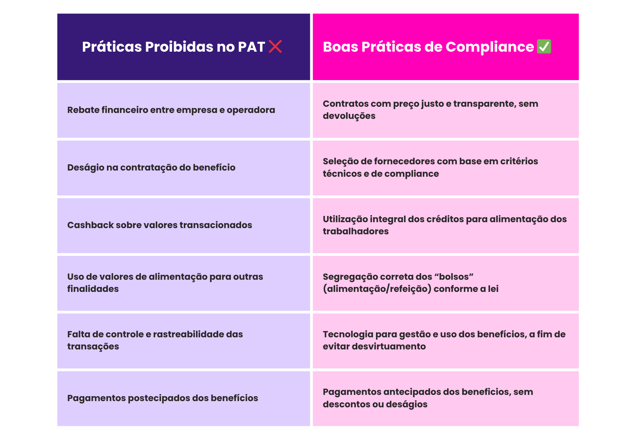 Essas práticas são ilegais porque descaracterizam o objetivo social do PAT, que é direcionar integralmente os recursos à alimentação do trabalhador, visando atender os interesses do empregado com um acesso facilitado ao benefício efetivamente voltado à sua Alimentação, saúde e bem-estar. Além disso, o uso dessas práticas pode acarretar perda do incentivo fiscal, multas e outras responsabilizações.